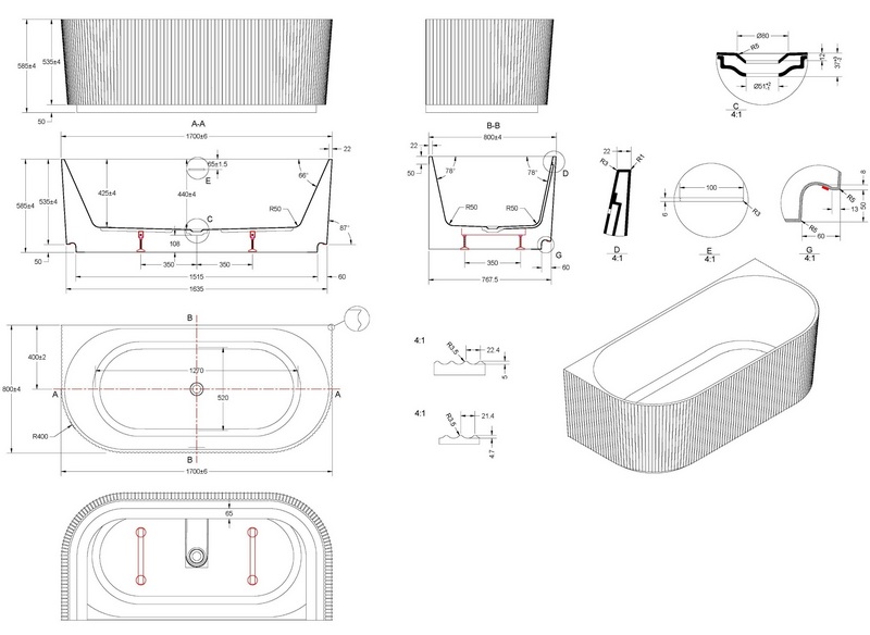 Ванна акриловая Vincea VBT-706-1700, 1700*800*585, цвет белый, щелевой перелив, слив белый, , шт