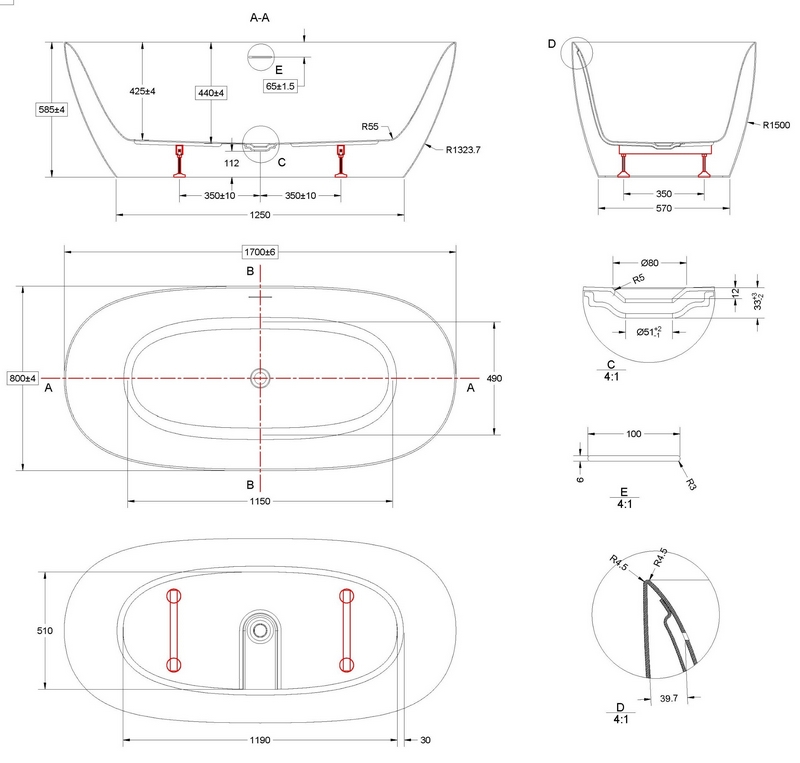 Ванна акриловая Vincea VBT-708-1700, 1700*800*585, цвет белый, щелевой перелив, слив белый, , шт