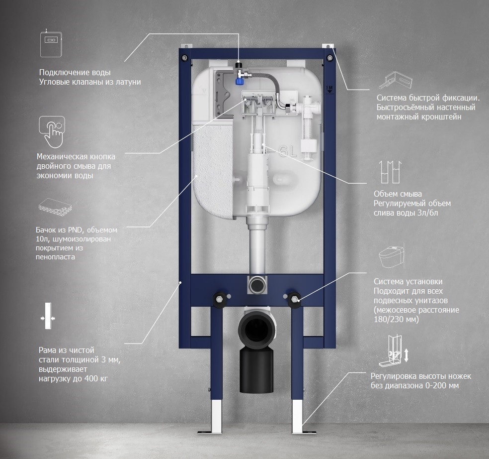 - Объем воды для смыва, заводская установка 6 и 3 л (возможна регулировка объема воды малого смыва от 3 до 4,5л, большого смыва от 6 до 7,5л). Общий объем воды в бачке – 10л