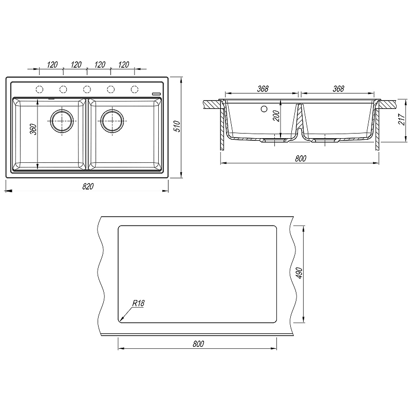 - Предусмотрено 5 намеченных отверстий под смеситель и для установки аксессуаров.