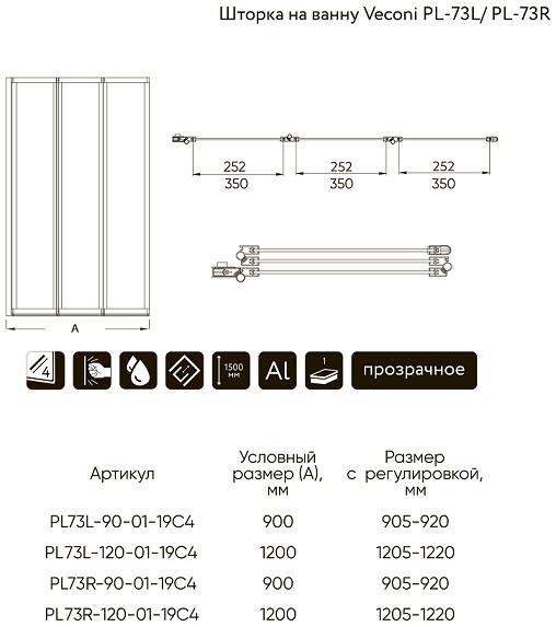 Шторка на ванну Veconi PL73L-90-01-19C4 R/L
